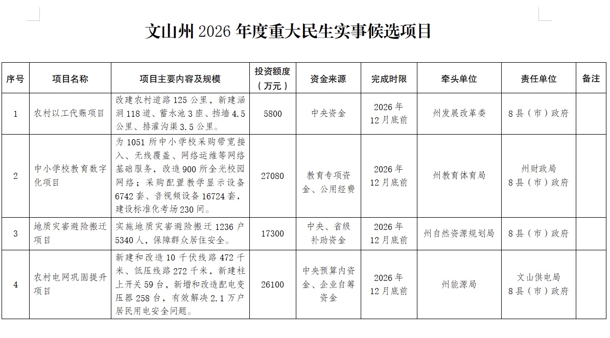 文山州人大常委会关于批准文山州人民政府2026年度重大民生实事候选项目的决议