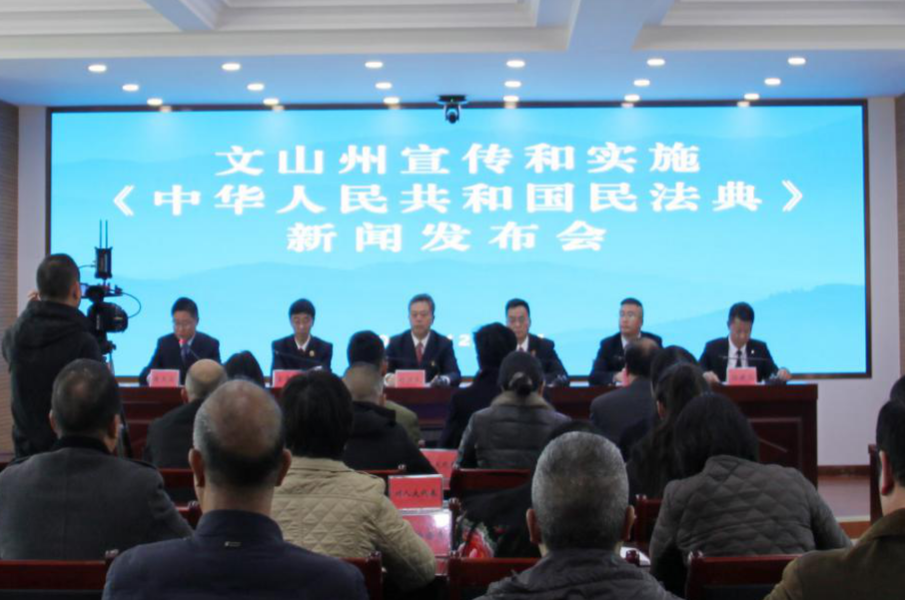 12月24日,州人大常委会在文山日报社新闻发布厅,组织召开文山州宣传和实施《中华人民共和国民法典》新闻发布会。州人大常委会、州中级人民法院、州人民检察院、州司法局、州律师协会5家单位联合发布民法典相关内容。