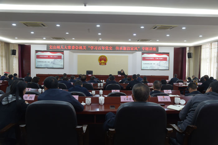 根据《州人大常委会机关2021年精神文明建设工作方案》的通知要求,结合当前正在深入开展的党史学习教育活动,10月21日,文山州人大常委会机关邀请文山学院仝杏花副教授为机关干部职工作“学习百年党史 传承廉洁家风”专题讲座。