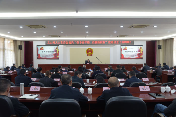 11月11日,文山州人大常委会机关以“奋斗百年路 启航新征程”为主题的2021年第四期道德讲堂开讲。州委党校潘春归老师通过讲唱结合的方式,带领干部职工鉴赏红色经典音乐作品,学习歌曲背后的党史故事,重温峥嵘岁月。
